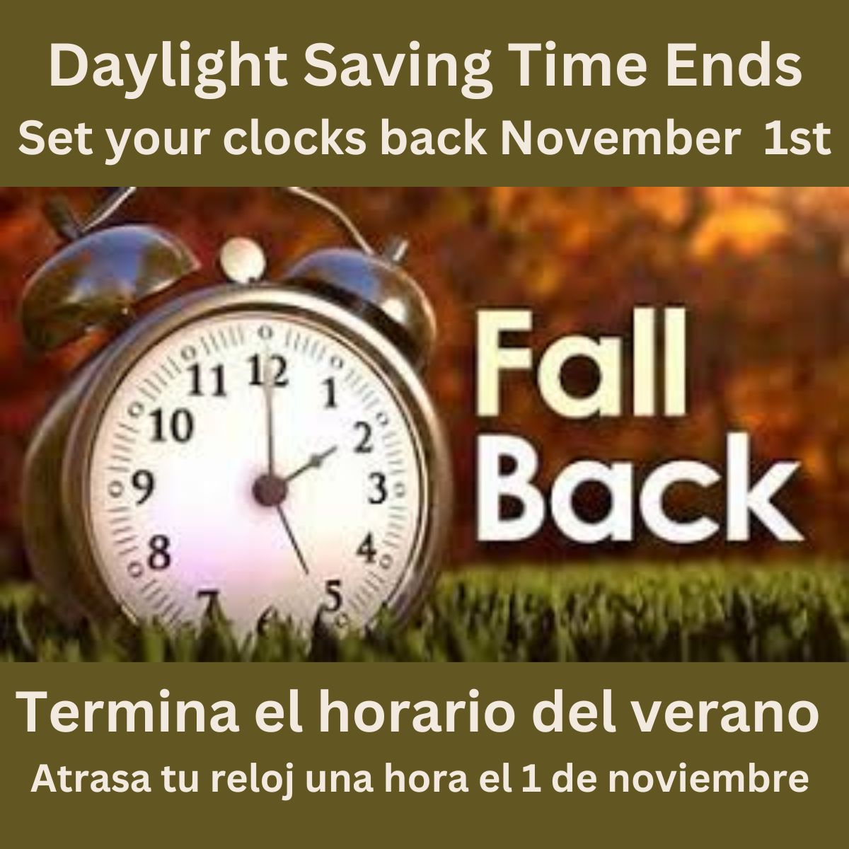 Don't forget to set your clocks back one hour before you go to bed on Saturday, November 1st.