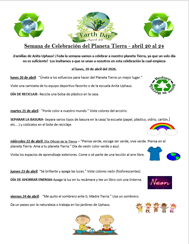 Miércoles 22 de abril 💚💙 Día de la Tierra Usa verde o azul 🌿 Visita los espacios de aprendizaje al aire libre o realiza una lección afuera