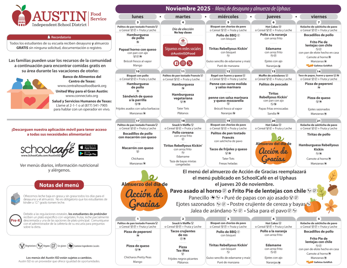 ¡Consulta lo que se servirá el próximo mes en Uphaus ECC! Ya están disponibles los menús de desayuno y almuerzo para 🔗 noviembre.