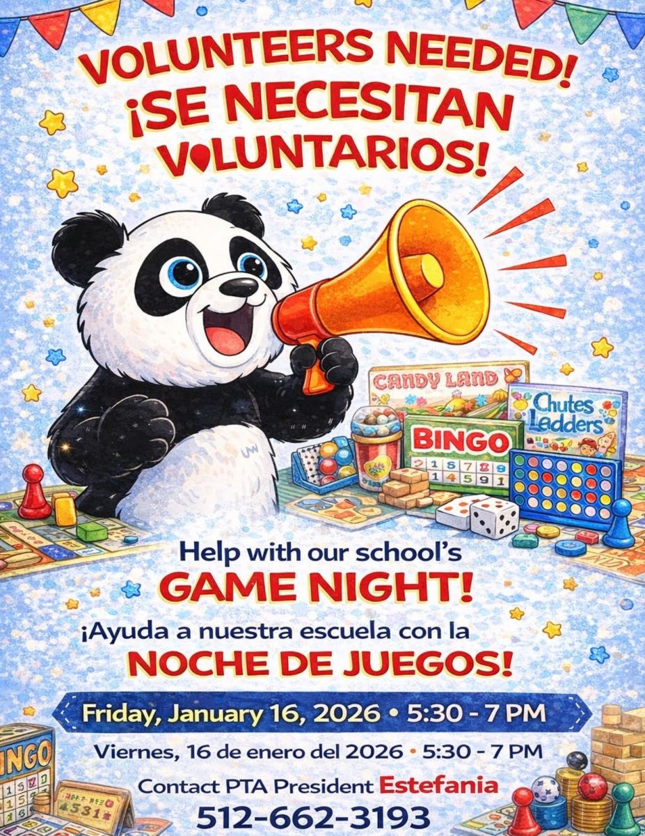 Estamos buscando voluntarios para ayudar con los juegos durante la Noche de Juegos (16 de enero, 5:30–7 p.m.).
