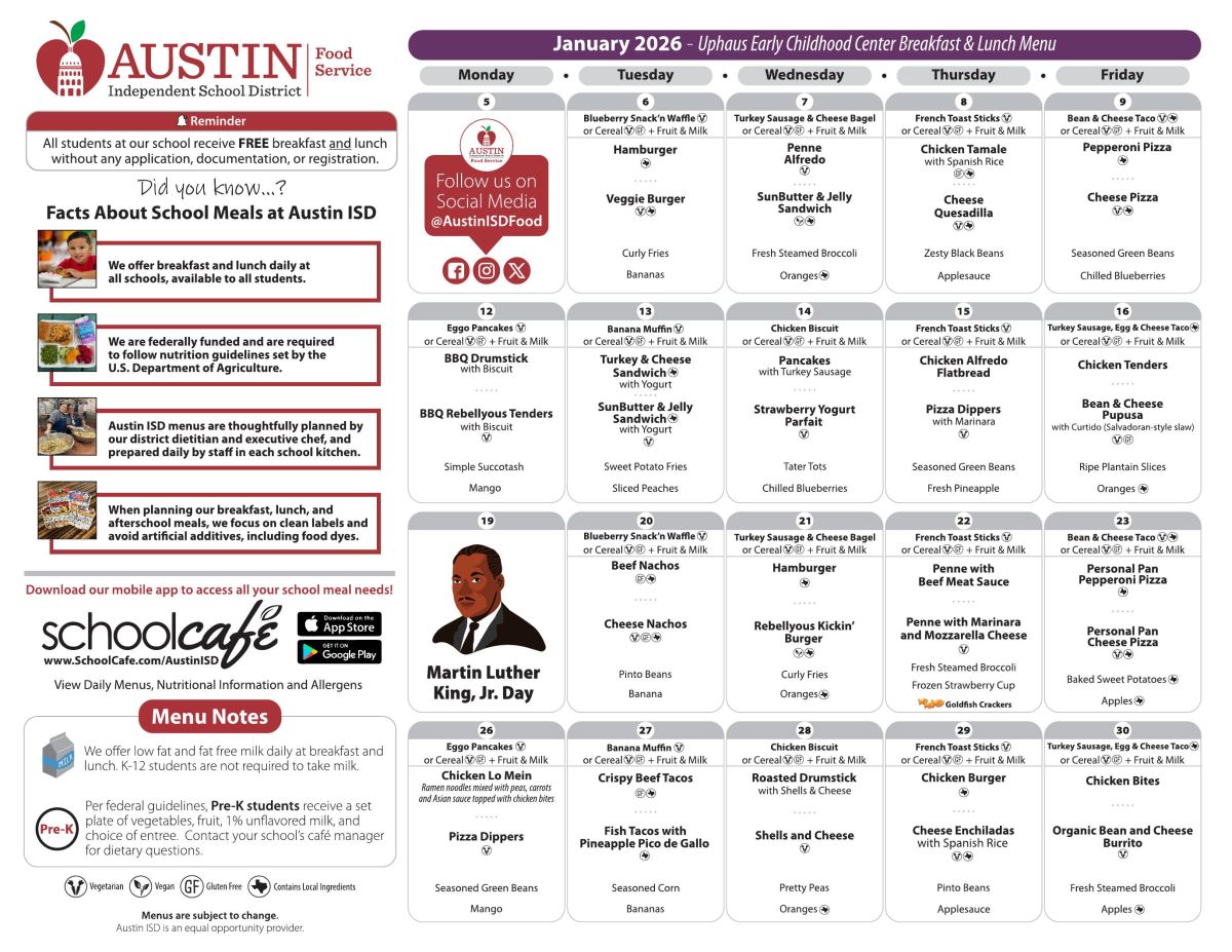 Uphaus is one of the schools in Austin ISD that qualifies for this program, so your child can start the day with a healthy breakfast and enjoy a nutritious lunch at no cost to you.