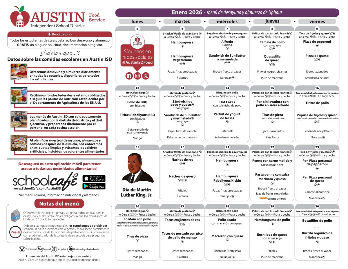 Uphaus es una de las escuelas de Austin ISD que califica para este programa, por lo que su hijo(a) podrá comenzar el día con un desayuno saludable y disfrutar de un almuerzo nutritivo sin costo para usted.